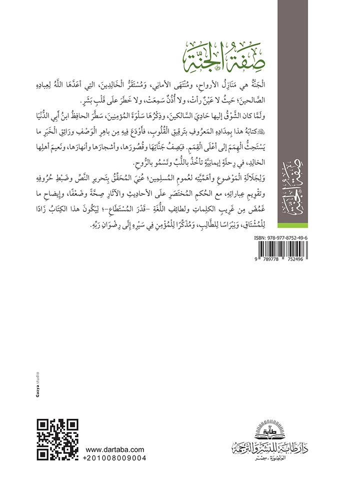 ولَمَّا كان الشَّوْقُ إليها حَادِيَ السَّالكينَ، وذِكْرُهَا سَلْوَةَ المُؤمِنِينَ، سَطَّرَ الحافِظُ ابنُ أَبِي الدُّنْيَا كتابَهُ هذا بِمِدَادِهِ المَعرُوفِ بتَرقِيقِ الْقُلُوبِ، فأَوْدَعَ فِيهِ مِن باهِرِ الْوَصْفِ ورَائِقِ الْخَبَرِ ما يَسْتَحِثُّ الْهِمَمَ إلى أعْلَى الْقِمَمِ. فيَصِفُ جَنَّاتِهَا وقُصُورَها، وأشجارَها وأنهارَها، ونَعيمَ أهلِها الخالِدِ، في رِحلَةٍ إيمانِيَّةٍ تأخُذُ باللُّبِّ وتَسْمُو بالرُّوحِ.