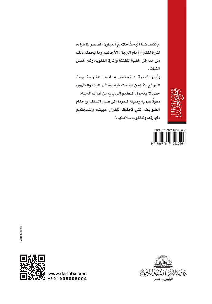 يكشف هذا البحثُ ملامحَ التهاون المعاصر في قراءة المرأة للقرآن أمام الرجال الأجانب، وما يحمله ذلك من مداخل خفية للفتنة وإثارة القلوب، رغم حُسن النيات.